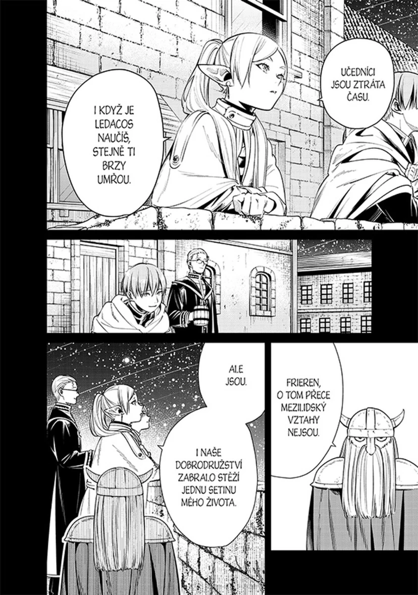 Frieren se svou učednicí Fern po několika letech putování poprvé obrací své kroky k jasnému cíli. Tím je Ende, krajina na dalekém severu, kde údajně odpočívají duše padlých hrdinů – a kde Frierenina družina kdysi svedla vítězný boj s Králem démonů. Přidává se k nim Stark, mladý válečník, který se svému umění učil u samotného Eisena. Nový společník jim přijde vhod: Frieren na její cestě nečekají pouze vzpomínky na minulost, ale také mocní nepřátelé.