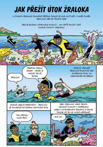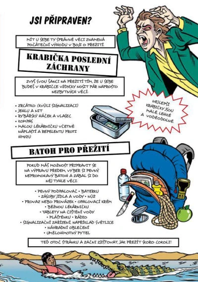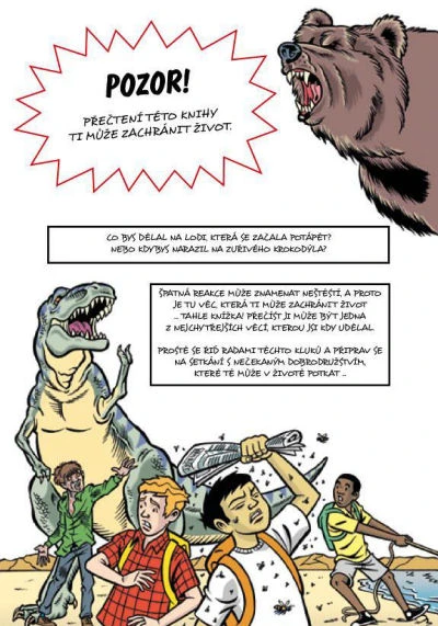 Skvělá kniha pro všechny kluky, kteří mají rádi dobrodružství. Barevný komiks, který čtenářům poskytne informace a instrukce, jak si počínat v nečekaných situacích. A nejde jen o situace, které se mohou běžně stát - uštknutí hadem, bloudění v lese, útok včel, lavina nebo lesní požár, ale i o situace, které jsou sice méně pravděpodobné, ale je lepší být připraven - jak přežít útok krokodýla, problémy při seskoku s padákem, jak se vyhnout lednímu medvědovi, ale i pobyt ve vesmíru a invazi zombie. Tuhle knížku budou kluci milovat!