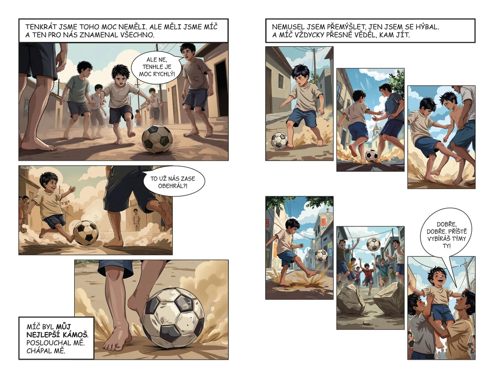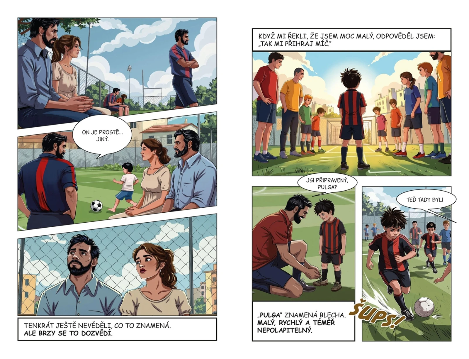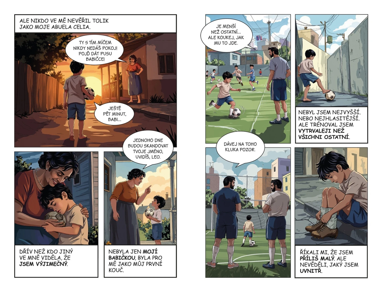 Než se Lionel Messi stal světovou ikonou, byl to jen kluk z argentinského Rosaria – malý vzrůstem, ale s obrovským srdcem. Lékaři mu diagnostikovali růstovou poruchu a řekli mu, že možná nikdy nebude hrát fotbal. Malý Leo se ale odmítl vzdát, trénoval tvrději, snil víc a bojoval o každou příležitost. Komiks tě vezme na skutečnou cestu jednoho z nejlepších fotbalistů všech dob. Od pouličních zápasů se Messi dostal na příčku vítězů mistrovství světa, vyhrál největší klubové i národní soutěže, vstřelil stovku gólů a překonal řadu rekordů.