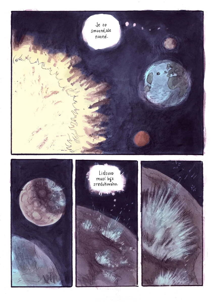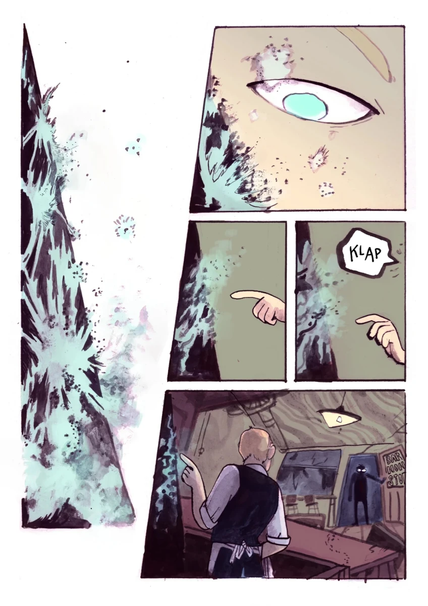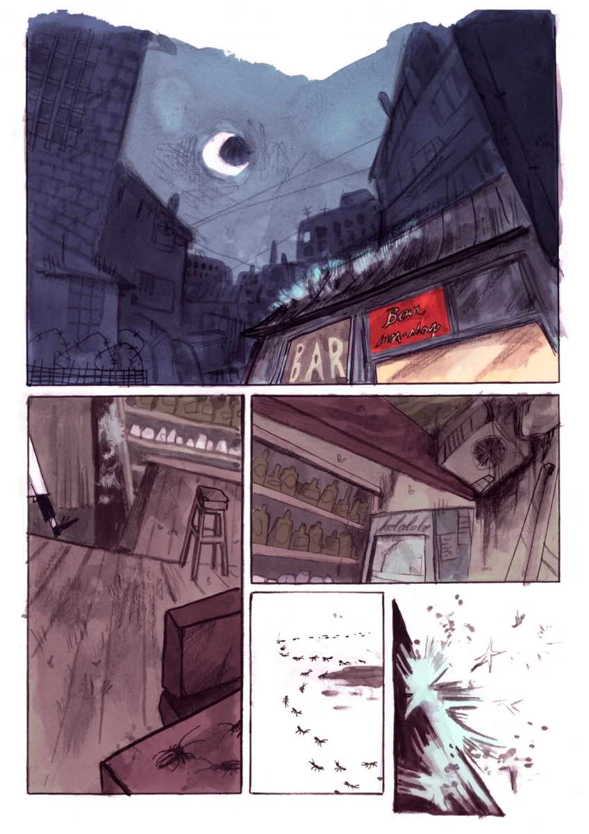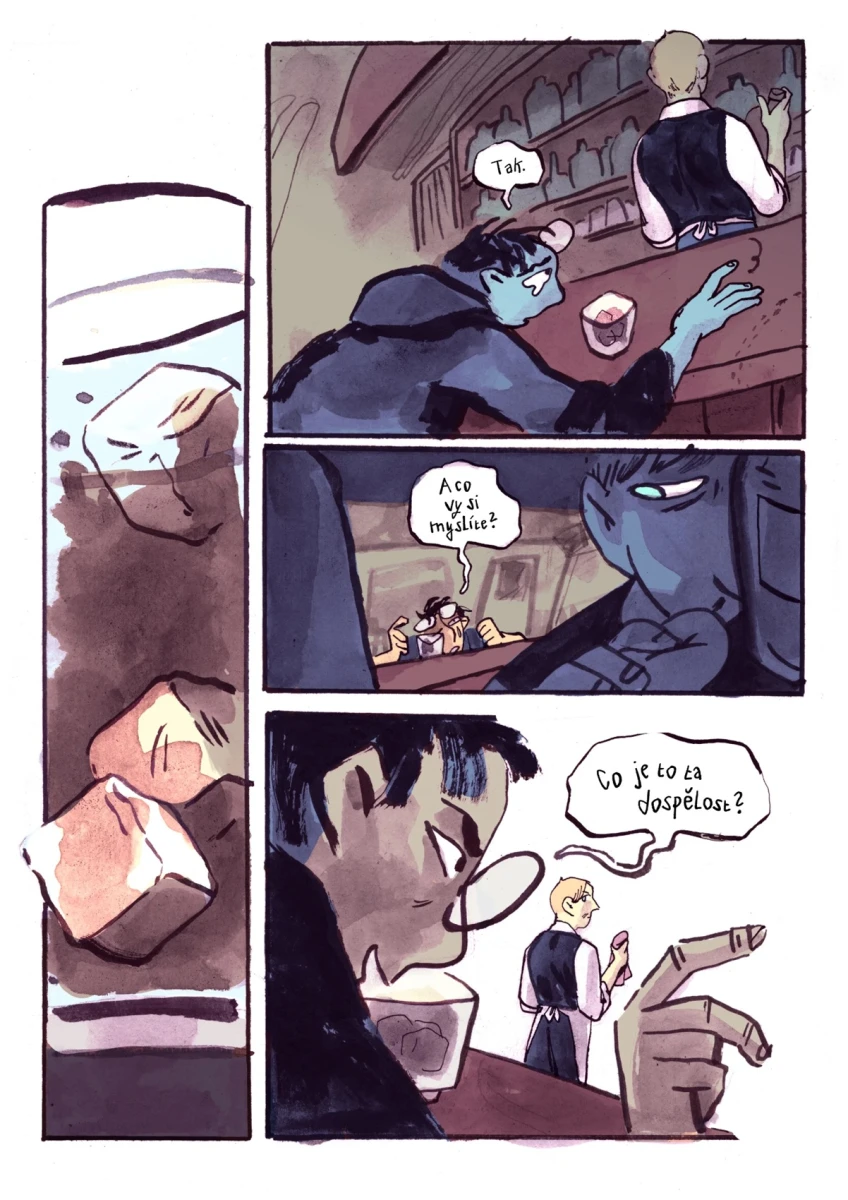 Noční bar a v něm dvě postavy. Na jedné straně barového pultu člověk snažící se svou sebelítost utopit v alkoholu, na straně druhé barman, který už ztratil víru v lidstvo. Kam je zavede jejich rozhovor? A co se skrývá na odvrácené straně Měsíce? Komiks původně vznikl pro inovativní veletrh digitálních komiksů ShortBox Comics Fair 2025, který představuje originální komiksy od umělců z celého světa.