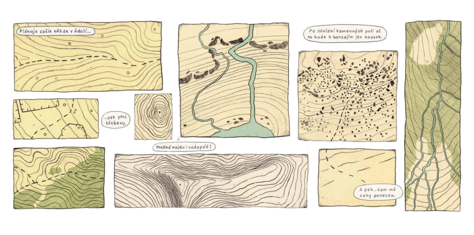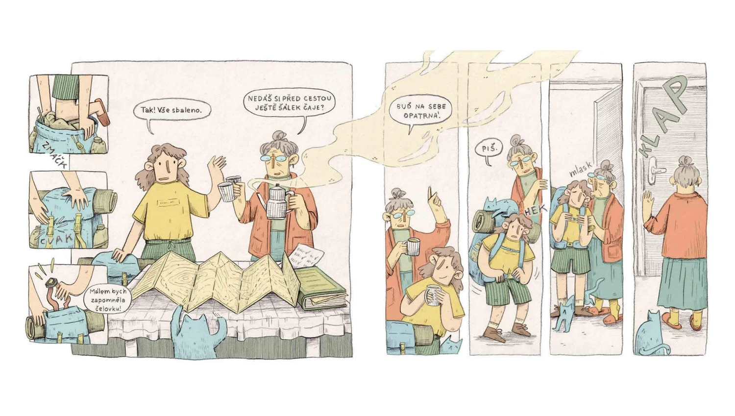 Hlavní hrdinka se vydává na dobrodružnou cestu, je mladá, energická, odhodlaná, zatímco její babička zůstává doma s kočkou a svými vzpomínkami. Prostřednictvím pohlednic, které vnučka posílá, se babička doslova noří do nádherných krajin a stává se součástí vnuččina putování. Navštěvuje pastvinu plnou ovcí, zahradu s největšími lekníny nebo sirné prameny. Autorka v knize na pomezí komiksu a ilustrace ukazuje, jak hluboký a naplňující může být vztah mezi lidmi z odlišných generací.
