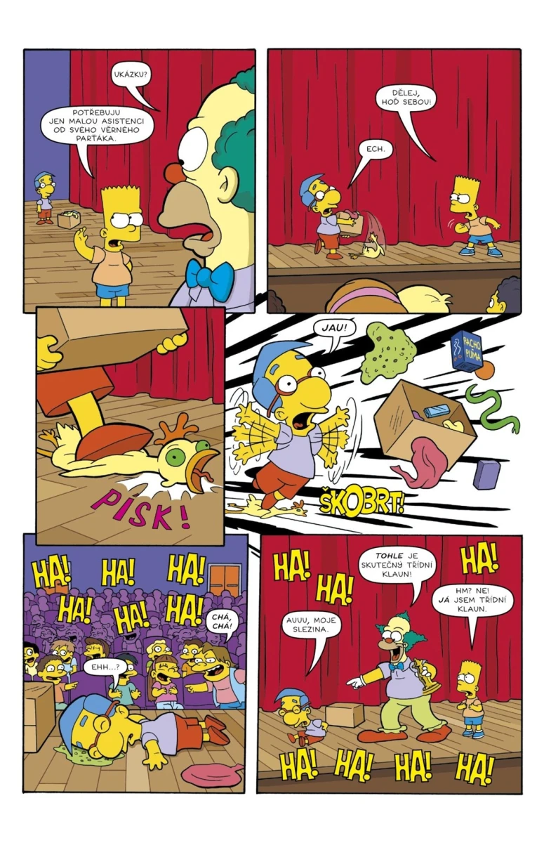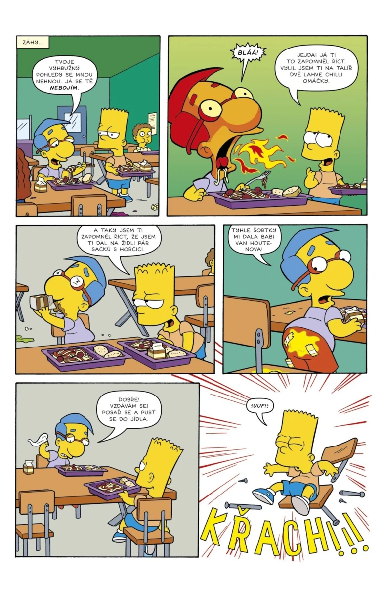 Připojte se k Bartu Simpsonovi a jeho kamarádům, kteří se utkají o titul třídního klauna, přelstí robotického školníka propadlého amoku, zasurfují si na sociální síti i v obrovské kaluži bláta, naučí se hrát blues, získají zpět elán a mnoho, mnoho dalšího! Dokonce i v případě, že si nosíte oběd v krabičce, tahle knížka vám zaručí, že splníte a dokonce i překročíte doporučenou denní dávku smíchu.